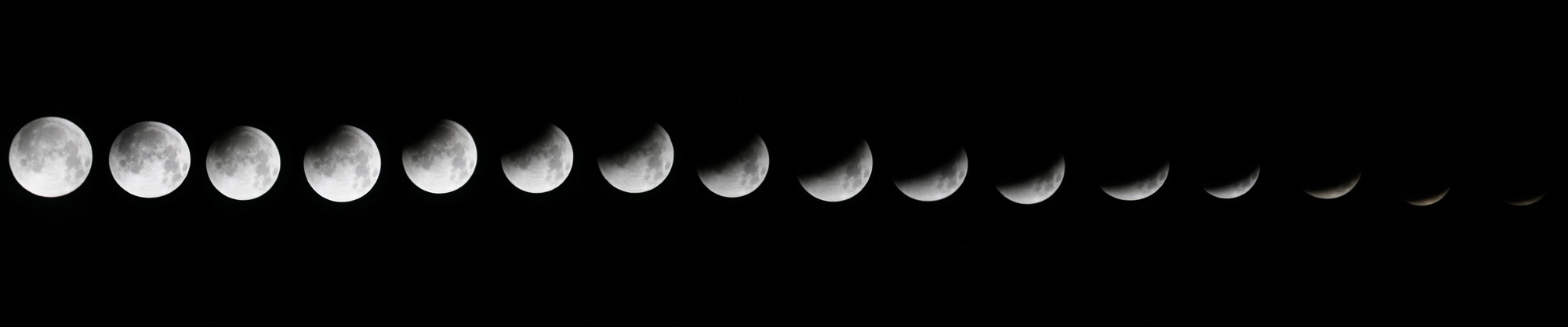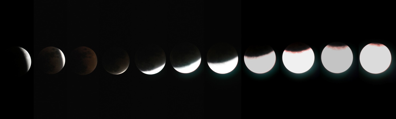 Composite image of photographs of the total lunar eclipse on February 21, 2008. Here's the