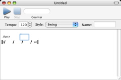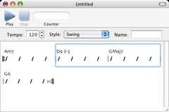 Chords are entered in song document windows in MyJazzBand using its built-in chord editor. The chord editor uses the Cocoa features text completion and input validation to enable you to enter chords quickly and accurately. It also uses an optimal spacing algorithm to lay out and display the chords beautifully.