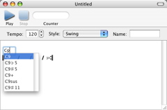 When text completion is invoked MyJazzBand shows you all the valid endings that may following the current input. Any time after the root of the chord has been typed, you can hit F5 (function key 5) or Option-Escape to see what the possible completions are. For example, hitting F5 after typing the root C will show all the possible C chords listed above. Hitting F5 after typing C9 will show C9, C9♭5, C9♯5, C9+, C9sus, and C9♯11. These are all chords beginning with C9 that MyJazzBand recognizes.
