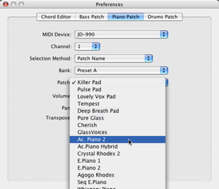 You can verify that patches can now be selected by name for this MIDI device by choosing it in the Bass Patch, Piano Patch, or Drums Patch panel in the Preferences panel. You should be able to select a bank and patch for this MIDI device by name.