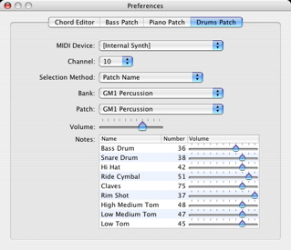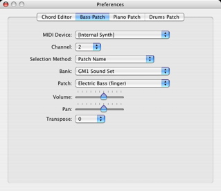 The Bass Patch, Piano Patch, and Drums Patch panels let you specify the MIDI device, MIDI channel, and patch for playing the bass, piano, and drums, respectively. They also let you specify the volume and pan of these instruments, and an optional transposition up or down an octave.