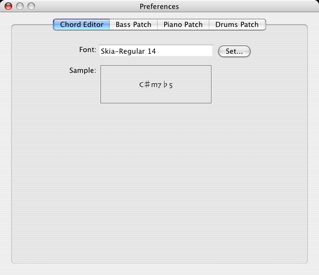 Application preferences such as chord editor font and font size, and bass, piano, and drums patch parameters are set in the preferences panel.