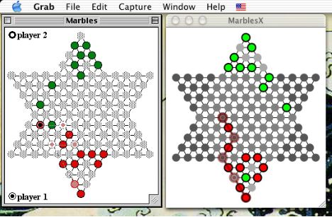 Once you've downloaded and built MarblesX, here's how you play. Click on the piece you want to move, click its destination, then click the latter again to finalize. Before the last click, change your mind by clicking on another destination or on the piece to cancel.