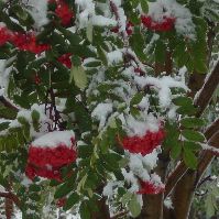 There're still a lot of leaves on the trees. So the snow weighs quite heavily on them. Somehow the amazing trees manage. If the snow's too heavy, it falls off. Great design! Here's a picture of the fruits on my American mountain ash. The deer love them. I saw one put its front legs on the fence to reach the higher branches. They must taste good.