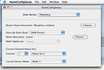 Ive finished implementing the setup utility described yesterday for editing the name configuration stored in CoreMIDI. NameConfigSetup allows you to set and change the master name document for each device. Each patch bank in the master name document may be overridden with a patch name list in another name document. NameConfigSetup also allows you to edit this information.