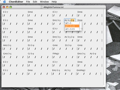 I wrote some code to allow the user to navigate within a chord chart in the chord editor using the arrow keys. The left and right arrow keys move to the previous and next beats, respectively. So do the tab and shift-tab keys (to be consistent with Cocoas selection of text fields). Option left and right arrow keys move to the next half note. Command left and right arrow keys move to the beginning of the previous and next bar, respectively.
