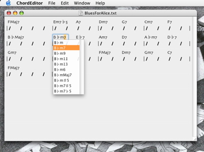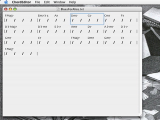 fmaj7 and dmmaj7 and the formatter will automatically capitalize them correctly for you.My next step is to implement cut, copy, and paste using the mouse. Ill be using a bar as the smallest unit on which the program will operate. This is similar to Finales mass mover and mass edit tools. First I have to learn about the NSUndoManager. Ive found an article on MacEdition and another article on this topic. Ill read them and report back soon.