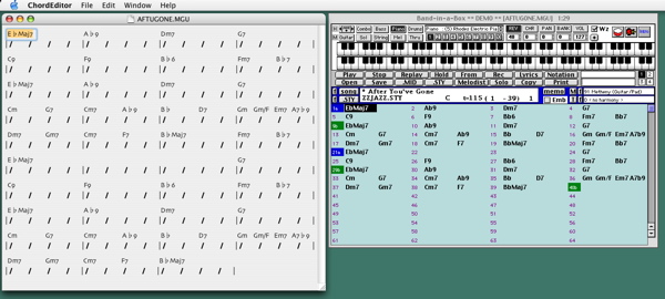 Now that Ive worked out the file import architecture and code, implementing it in my program is just a simple matter of translating the C++ code for reading BiaB files I wrote earlier into Objective C/Cocoa. Ive done that for both routines: one that reads files written by BiaB 4.0 and above, and one for reading older files. Heres the chord editor running along side the BiaB demo, both with the same BiaB format file opened. The file import code I posted yesterday has also been integrated. So if an imported file has been edited, the chord editor will prompt the user for saving it in native file format (i.e., the text format I coded up last week) when it is closed or saved.