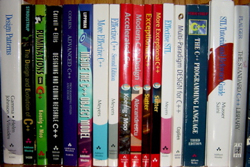 [Read this book to learn C++ quickly.] The C++ Programming Language (Special 3rd Edition). B. Stroustrup. A-W. 2000. [Self-explanatory.] Effective C++ (2nd Ed.). S. Meyers. A-W. 1997. More Effective C++. S. Meyers. A-W. 1995. Exceptional C++. H. Sutter. A-W. 2000. More Exceptional C++. H. Sutter. A-W. 2002. [Read these to learn to use various elements of C++ correctly.] STL Tutorial and Reference Guide: C++ Programming with the Standard Template Library (2nd Ed.). D.R. Musser, G.J. Derge, and A. Saini. A-W. 2001. [Read this to learn to use the STL.] Effective STL: 50 Specific Ways to Improve Your Use of the Standard Template Library. Scott Meyers. A-W. 2001. [Read this to learn to use the STL correctly.] Modern C++ Design. A. Alexandrescu. 2001. [Read this to learn what C++ templates can do (I know, the book is also about design patterns). If you do not read this book, at least read something about generic programming and templates, e.g., implement your own STL containers, template expressions, etc.] Multi-Paradigm Design for C++. J.O. Coplien. A-W. 1999. [Read about program design using C++.] Design Patterns: Elements of Reusable Object-Oriented Software. E. Gamma, R. Helm, R. Johnson, and J. Vlissides. A-W. 1995. [Of course this is the "gang-of-four" book, and not a C++ book. But with all that C++ youve learned, this book will teach you practical object-oriented design. Design patterns are not software engineering, and will better deliver on the promise of bridging the gap between coding and design.] The Design and Evolution of C++. B. Stroustrup. A-W. 1994. Ruminations on C++. A. Koenig and B. Moo. A-W. 1997. [Read the rationale of design decisions that went into the language.] C++ Gems: Programming Pearls from The C++ Report. S. B. Lippman (Ed.). SIGS Books. 1997. More C++ Gems. R.C. Martin (Ed.). SIGS Books. 2000. Design and Coding Reusable C++. M.B. Carroll and M.A. Ellis. A-W. 1995. Advanced C++. J.O. Coplien. A-W. 1992. Inside the C++ Object Model. S.B. Lippman. A-W. 1996. [(Optional) These are all books of great historical interest. They may be difficult to read because the C++ language was still evolving at the time of writing.]
