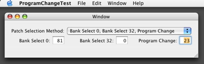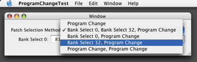 Worked out a little GUI for selecting the patch for a track. It turns out that different synthesizer manufacturers employ different methods for selecting patch banks. But the ones shown in the popup button below are the most common ones and are ones supported by Opcode Vision and Coda Finale. So thatll be good enough for me for the moment.