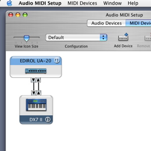 First we specify all the external MIDI devices connected in Audio MIDI Setup. In this example the setup consists of a single Yamaha DX-7 II.