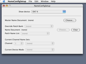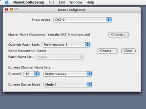 This means that MIDI applications cannot refer to patches by name yet. To enable this a master name document needs to be chosen for the MIDI device. When the Choose... button in NameConfigSetup is clicked, a open file panel appears where we can choose a MIDI name document. In this example we choose the file Yamaha DX7 II.midnam.xml which contains the names of factory default patches.