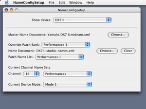The design of the name config property of a device in CoreMIDI allows each of its patch banks to be overriden by a patch bank in MIDI name documents other than the master name document. One way to use this mechanism is to have a patch librarian application fetch patch names by exchanging sysex messages with a MIDI device, write out the MIDI name document that represents these patch names, and override the factory default patch names with these current ones. I wrote a utility called MidnamUtility that does exactly this (with embedded Python, I might add). After generating the MIDI name document (called DX7II-studio-names.xml in the example), I override the factory default performance names with those in it in NameConfigSetup.