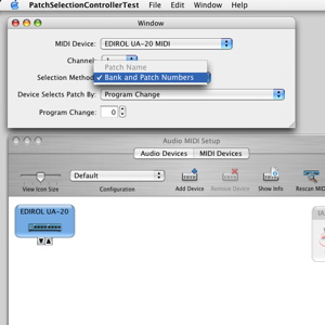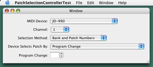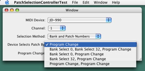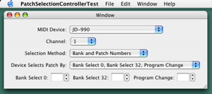 The following screenshots illustrate the external changes that may occur for our patch selection test program. Before an external MIDI device is specified in Audio MIDI Setup, the MIDI interface name appears in the MIDI Device menu. Of course no MIDI name document can be associated with the MIDI interface. So only the Bank and Patch Numbers selection method is enabled.