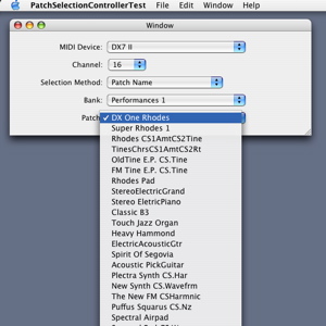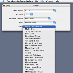 We can verify that patch names are now associated with the MIDI device in my patch selection test program. The patch names appear in the menu of the patch pop-up button.
