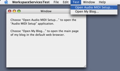 No wonder so many Cocoa applications have menu commands that take you to web pages. Anyway I have written a sample program that demonstrates the use of these two methods. Heres a screen shot.