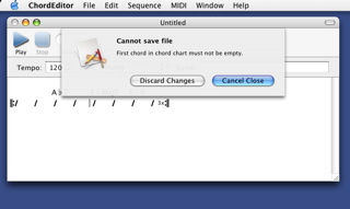 A chord chart is considered invalid if no chord is entered for the first beat of the first bar because we wouldnt know what chord to play for the first few beats. In the following example, no chord is specified for the first two beats of the song. The chord editor will report an error when it reads such a chord chart in text format. Therefore it must not save such a chord chart either.