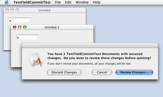 Heres a screen shot of the sample application in action. The text fields in the two documents contain characters that were typed but not committed. Quit was selected at this time, which results in the dialog for giving the user a chance to review the two changed documents.