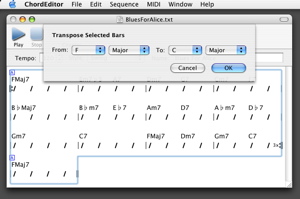 Implemented a transpose function in the chord editor. Unlike BiaB and MiBAC Jazz, in my design the user can transpose chords in the current selection instead of always transposing entire tunes. Of course the transpose operations are recorded in the undo manager and can be undone and redone.