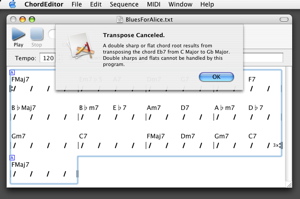 The implementation uses the jazz theory classes to handle enharmonic chord and note spellings. Correct spellings will therefore be used automatically for the transposed chords and bass notes. Since the chord editor cannot handle chord and note names that are double sharp or double flat, a dialog is displayed to inform the user that a transposition that results in such a chord or note name cannot be performed.