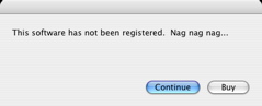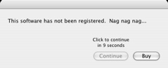 I wrote some code to display a nag screen. When an unregistered application is launched, a window is displayed to remind the user to register. It also inconveniences the user a little by enabling the button to dismiss it only after a short delay.