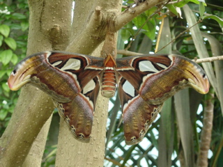 Across from the Butchart Garden is the Butterfly Garden. Its well worth a visit and takes about an hour to walk around. Heres an atlas moth with a 10" wing span! The pattern on the tips of the wings looks like snake heads. These creatures live for five years in their cocoons and then emerge and live only three to five days to breed. Dont even have mouths and digestive systems. Hmm...