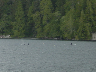 Heres another picture of the orcas. You should be able to see two quite clearly near the shore. If you look closely, theres another just below the surface in the foreground, a little to the left.