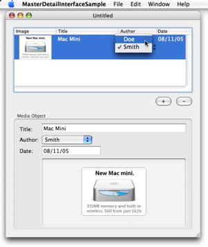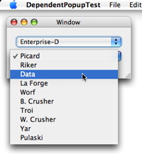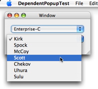 sample project that uses the same techniques in the master-detail interface sample. How often does one find it necessary to re-populating a popup button when the selection in another GUI element (say another popup button) changes? E.g., in a MIDI application, the choices available in a patch name popup button must be changed when a different MIDI device and/or channel is selected. Using Cocoa bindings, no code (except for that for maintaining the underlying data model, of course) is required to accomplish that.