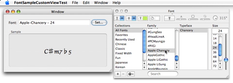 sample project I posted last year for choosing a font in the Font Panel, displaying a sample text in that font, and saving the font in user defaults. My