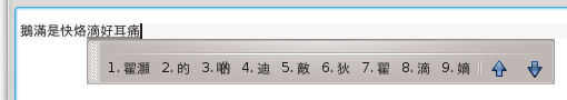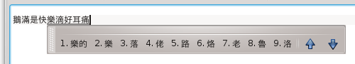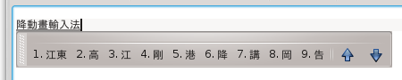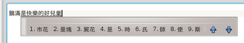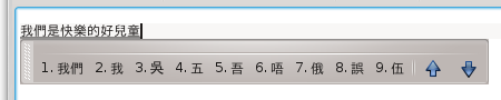 instead? CAP shows you all words that can begin the current romanization in the conversion buffer in a candidate window, ordered by decreasing likelihood it determines for them given the context. The candidate window shows only one row of candidates at a time and can be scrolled up and down using the up and down keys or the page-up and page-down keys. Of course if you’ve used any kind of input method at all, you’re familiar with this.