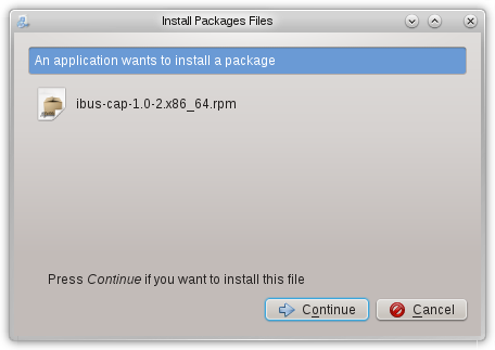 The following is a snapshot of the panel displayed by the Apper software manager after I click on the file ibus-cap-1.0-2.x86_64.rpm in the Dolphin file manager on OpenSuse. When I click the Continue button in the panel, I’ll be asked to type in the administrator password so that the installation can proceed.