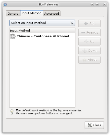 The IBus Preferences panel will appear. Click the Input Method tab. In the Select an input method popup menu, select Chinese -> Cantonese AI Phonetic IM, then click the Add button. The resulting panel should look like this: